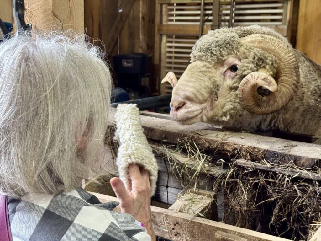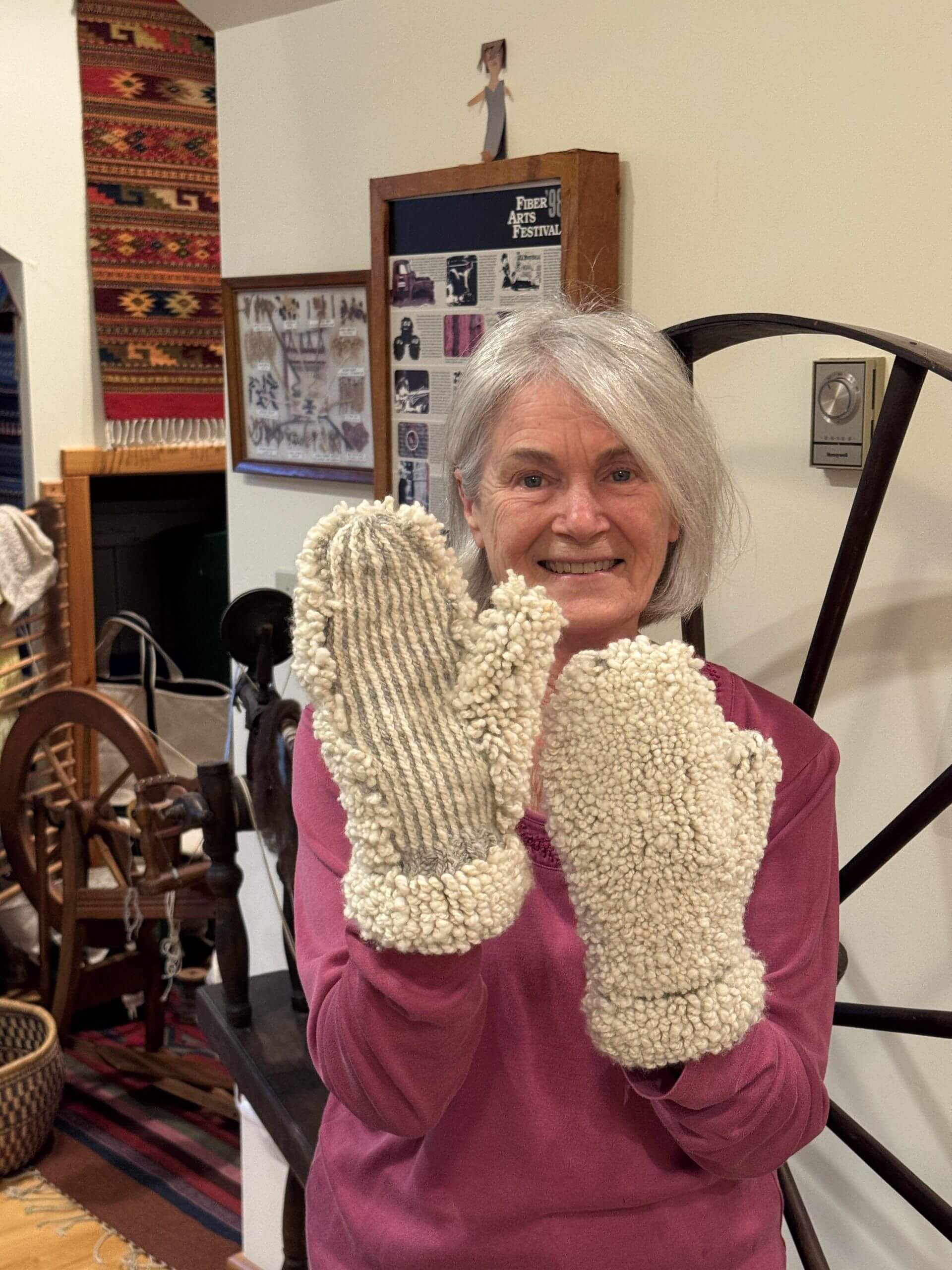 Pearsall created the mittens with hand-carded and hand-spun fiber: 50 percent cashmere sourced from the Pangong Craft Center in the high Himalayas of India, 25 percent fiber from a merino ram and flock at Whitefield Farm in Vermont, and 25 percent dyed merino-silk blend from the stash of Pearsall’s daughter-in-law, a felt artist in Queensbury, New York.